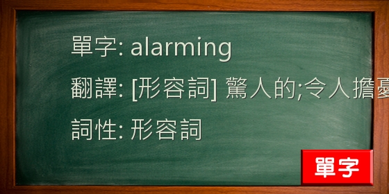alarming [形容詞] 驚人的;令人擔憂的;告急的
