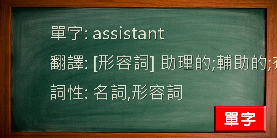 assistant [形容詞] 助理的;輔助的;有幫助的; [名詞] 助手