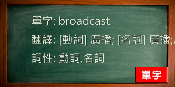 名詞: broadcaster | 動詞過去式: broadcast/broadcasted | 動詞過去分詞: broadcast/broadcasted | 動詞現在分詞: broadcasting | 動詞第三人稱單數: broadcasts |