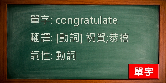 形容詞: congratulatory | 名詞: congratulator | 動詞過去式: congratulated | 動詞過去分詞: congratulated | 動詞現在分詞: congratulating | 動詞第三人稱單數: congratulates |