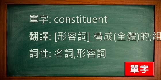 constituent [形容詞] 構成(全體)的;組成的;選舉的; [名詞] 成分;組成的要素;選民