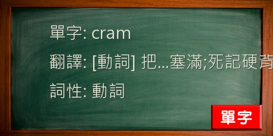 名詞: crammer | 動詞過去式: crammed | 動詞過去分詞: crammed | 動詞現在分詞: cramming | 動詞第三人稱單數: crams |