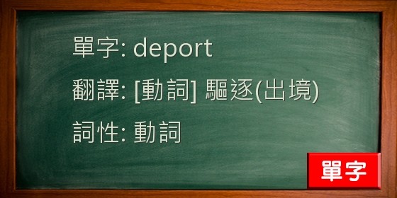 動詞過去式: deported | 動詞過去分詞: deported | 動詞現在分詞: deporting | 動詞第三人稱單數: deports |