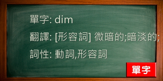 dim [形容詞] 微暗的;暗淡的; [動詞] 變暗淡;變模糊