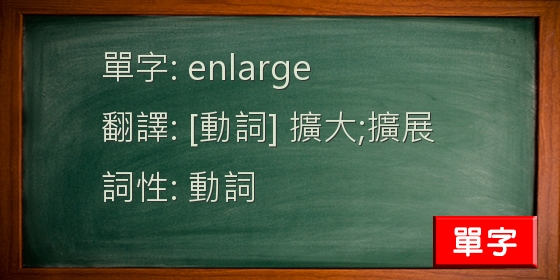 名詞: enlarger | 動詞過去式: enlarged | 動詞過去分詞: enlarged | 動詞現在分詞: enlarging | 動詞第三人稱單數: enlarges |