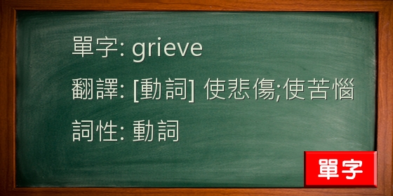 副詞: grievingly | 名詞: griever | 動詞過去式: grieved | 動詞過去分詞: grieved | 動詞現在分詞: grieving | 動詞第三人稱單數: grieves |