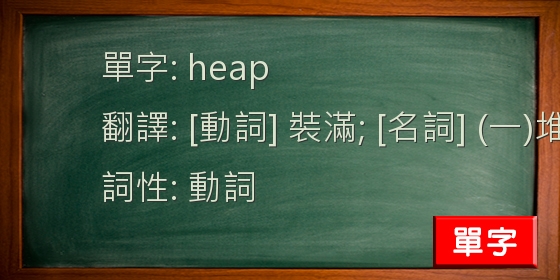 動詞過去式: heaped | 動詞過去分詞: heaped | 動詞現在分詞: heaping | 動詞第三人稱單數: heaps |
