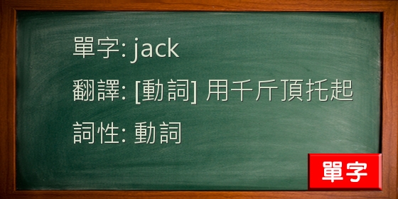 名詞: jacker | 動詞過去式: jacked | 動詞過去分詞: jacked | 動詞現在分詞: jacking |動詞第三人稱單數: jacks |