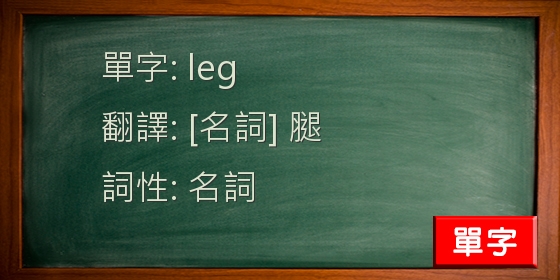 動詞過去式: legged | 動詞過去分詞: legged | 動詞現在分詞: legging | 動詞第三人稱單數: legs |