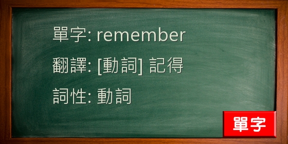 形容詞: rememberable | 名詞: rememberability | 動詞過去式: remembered | 動詞過去分詞: remembered | 動詞現在分詞: remembering | 動詞第三人稱單數: remembers |