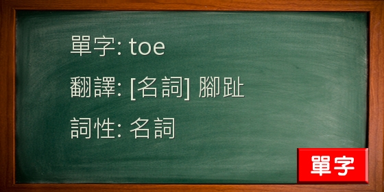 動詞過去式: toed | 動詞過去分詞: toed | 動詞現在分詞: toeing | 動詞第三人稱單數: toes |