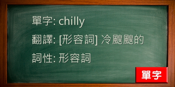 副詞: chillily | 形容詞比較級: chillier | 形容詞最高級: chilliest | 名詞: chilliness |