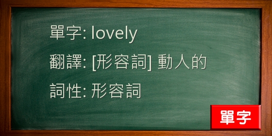形容詞比較級: lovelier | 形容詞最高級: loveliest | 名詞: loveliness | 名詞複數: lovelies |