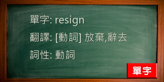 名詞: resigner | 動詞過去式: resigned | 動詞過去分詞: resigned | 動詞現在分詞: resigning | 動詞第三人稱單數: resigns |